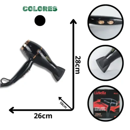 Este secador de cabello Lizbella PRO AC ha sido diseñado para el uso profesional y doméstico de alto rendimiento, combinando potencia, durabilidad y un diseño elegante. Es una adición de alto valor para el inventario de cualquier distribuidor o minorista especializado en productos de belleza y cuidado personal.