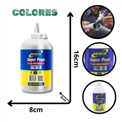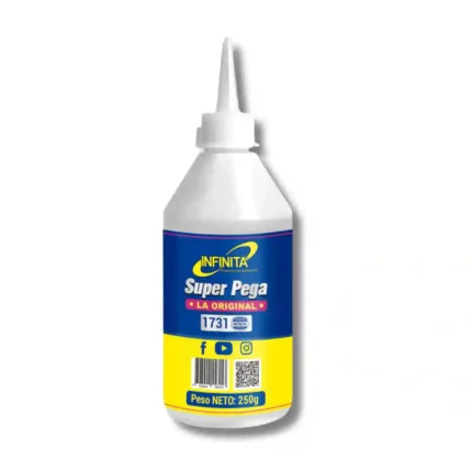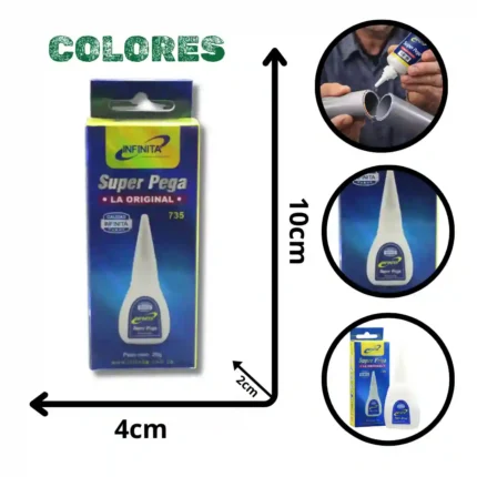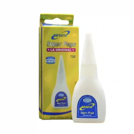 Adhesivo de alto rendimiento "Súper Pega - La Original" diseñado para reparaciones precisas y aplicaciones industriales o domésticas. Su fórmula está optimizada para ofrecer una unión fuerte en diversos materiales, garantizada por la calidad de la marca Infinita.