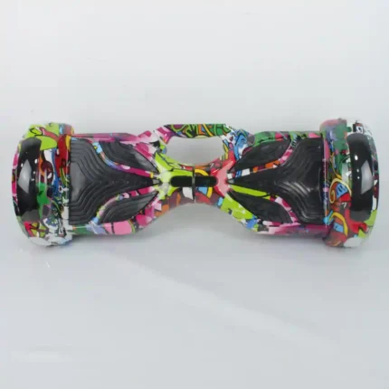 Patineta eléctrica auto-balanceada (hoverboard) con ruedas de tamaño estándar y un diseño gráfico estilo graffiti/urbano muy llamativo. Este producto de movilidad personal combina diversión y tecnología, incluyendo la funcionalidad Bluetooth para conexión. Es un artículo de alta demanda en el segmento juvenil y de tecnología recreativa, ofreciendo al revendedor un producto de alto valor percibido y gran atractivo visual.