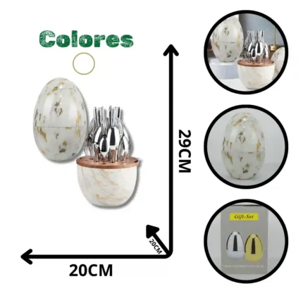 Exclusivo y sofisticado Set de Cubiertos de Lujo de 24 Piezas con un diseño de almacenamiento premium en forma de huevo. Esta variante presenta un acabado tipo mármol blanco con elegantes vetas doradas, creando un impacto visual de alto nivel. Clasificado como un set de regalo, es un producto de alta gama ideal para la reventa en tiendas de regalos de lujo, boutiques de decoración y establecimientos enfocados en el segmento premium.
