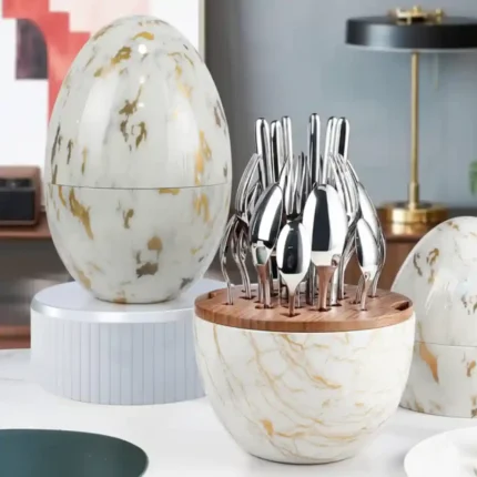 Conjunto de 24 Cubiertos de Acero Inoxidable con un diseño de almacenamiento de lujo, presentando un estuche en forma de huevo con acabado tipo mármol negro y vetas doradas/blancas. Este set es una pieza de decoración funcional que combina el estilo nórdico y la alta calidad del acero inoxidable. Es un producto premium con un alto factor sorpresa y atractivo estético, ideal para tiendas de regalos, decoración de interiores y el mercado de alto valor percibido.