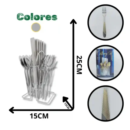 Conjunto de 24 Piezas de Cubiertos en Acero Inoxidable con un diseño ergonómico y pulido, complementado por un práctico soporte organizador de metal. Este set ofrece una solución de almacenamiento vertical que ahorra espacio en la cocina. Su presentación en una caja de diseño vibrante y profesional lo posiciona como un producto atractivo y funcional, con excelente potencial de venta al por mayor en el segmento de menaje y artículos para el hogar.