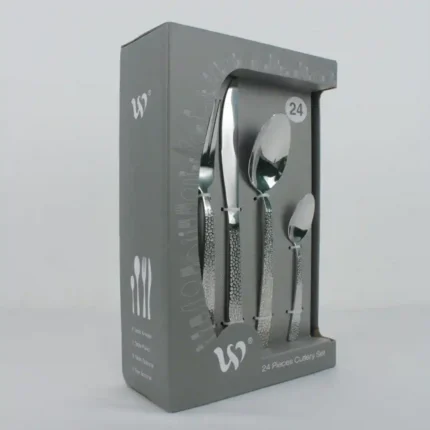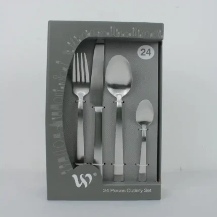 Presentación del Empaque: Caja de cartón individual con impresión a color, destacando las características de High Quality Stainless Steel y 24 Pcs Tableware.