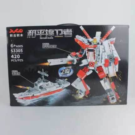Kit de bloques de construcción modular 2 en 1 de la marca JUGO. Permite ensamblar una imponente réplica de un Barco Destructor (Destroyer) o un Robot Mecha de Combate. Este set de temática militar y de ciencia ficción ofrece un doble valor de juego y reventa.