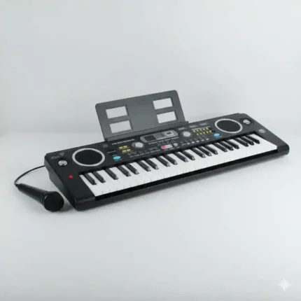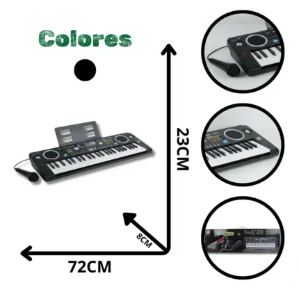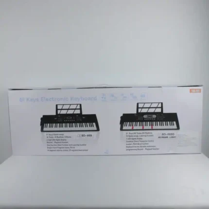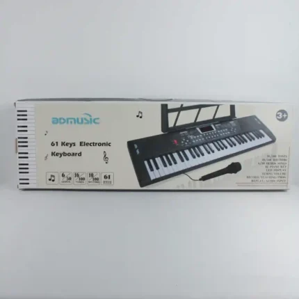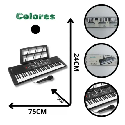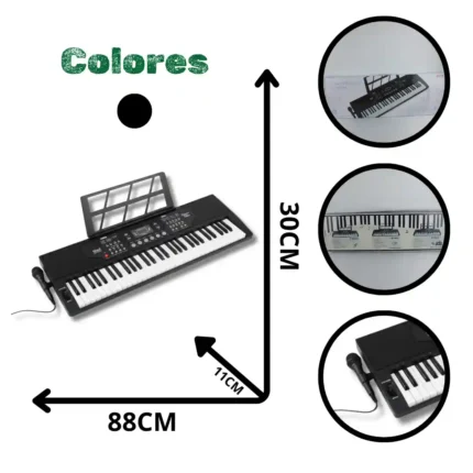 Instrumento musical electrónico de 61 teclas (tamaño estándar para principiantes), ideal para el aprendizaje, la práctica y la creación musical. Este teclado ofrece múltiples funciones de ritmo y tono, incluye un micrófono para karaoke y es un producto de alto valor percibido por su tamaño y capacidad.