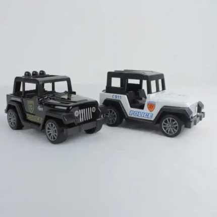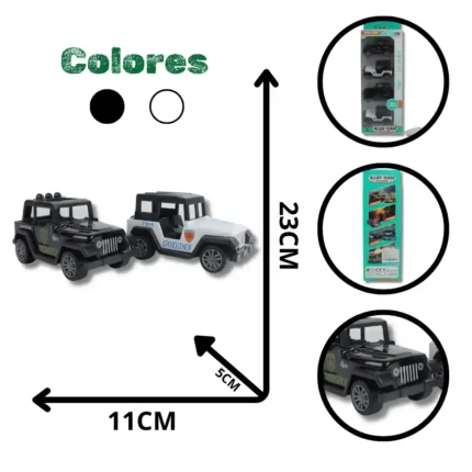 Pack de cuatro (4) mini vehículos tipo campero/jeep de policía en colores surtidos (blanco y negro), presentados en un set vertical de alto atractivo. Estos modelos son ideales para el juego de rol interactivo y la colección de vehículos robustos, siendo un producto de impulso con la denominación de calidad Alloy Team.