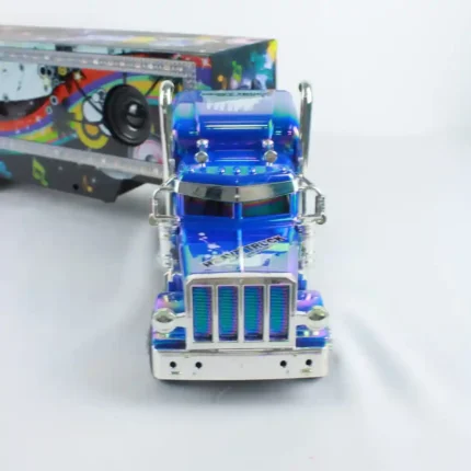 Este Parlante Mula de Juguete es un vehículo de gran tamaño que funciona como parlante portátil. El producto destaca por su diseño de camión de carga, con una cabina con acabado metálico brillante y un remolque decorado con gráficos vibrantes de estilo urbano. El remolque, que contiene el altavoz, se conecta a dispositivos de audio vía Bluetooth. Es un producto híbrido que combina el juego de un vehículo a escala con la funcionalidad de un gadget, lo que lo hace atractivo para un amplio rango de edades.