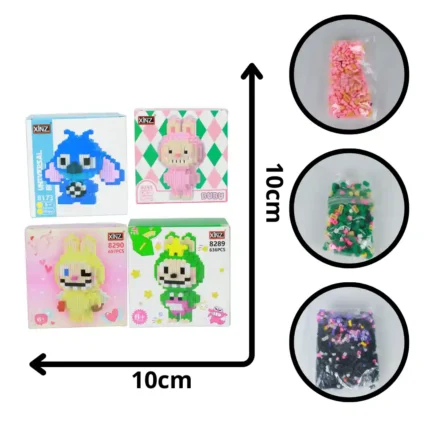 Set de bloques tipo mini fichas para armar figuras en 3D de personajes populares. Cada caja incluye todas las piezas necesarias para construir el personaje completo, presentadas en empaques individuales y con manual de instrucciones ilustrado.