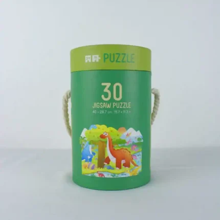 Set de rompecabezas con 30 piezas, ideal para niños mayores de 3 años. Este producto educativo y recreativo se presenta en un original empaque cilíndrico con asa de cuerda, disponible en dos diseños vibrantes: "Undersea Adventure" (Aventura Submarina) y "The Dinosaur Era" (La Era de los Dinosaurios).