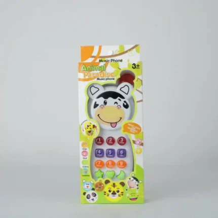 Juguete educativo e interactivo con forma de teléfono móvil, diseñado para el desarrollo temprano de habilidades en niños mayores de 3 años. Presenta un diseño amigable con temática de animales e incorpora luces y sonidos.