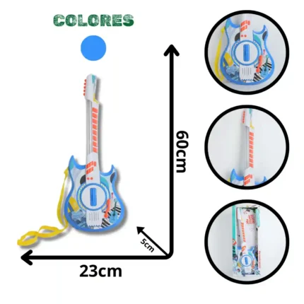 Presentamos la Guitarra de Juguete Infantil 3808B, un instrumento de simulación diseñado para la iniciación musical y el juego creativo en niños. Este modelo de gran tamaño imita la forma de una guitarra acústica en un color Azul o Verde Vibrante y cuenta con cuerdas de simulación que permiten la práctica del rasgueo, además de botones con funciones musicales y efectos de luz. Es un set completo con micrófono de pie, de alto impacto visual y rendimiento para revendedores de juguetes, tiendas de regalos y artículos educativos.