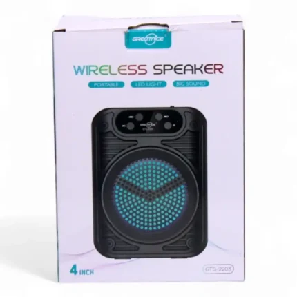 Este potente parlante de 4 pulgadas es la combinación perfecta de un "Big Sound" impactante y una vibrante iluminación LED, diseñado para transformar cualquier espacio en tu propio escenario personal. Compacto, portátil y lleno de características, el GTS-2203 es ideal para animar fiestas, disfrutar de tu música en casa o llevar la diversión a tus aventuras al aire libre.