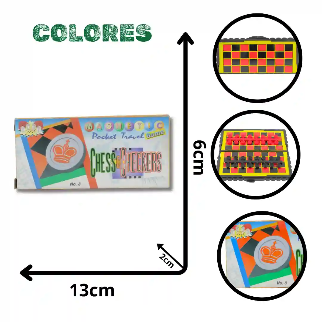 Juego de ajedrez magnético de formato compacto y portátil, diseñado para el entretenimiento en cualquier lugar. El tablero cuenta con una superficie metálica plegable que sirve como caja de almacenamiento para las piezas, garantizando que el set se mantenga completo y organizado. Su sistema magnético permite que las figuras permanezcan firmes sobre el tablero, evitando desplazamientos accidentales durante el juego o el transporte.