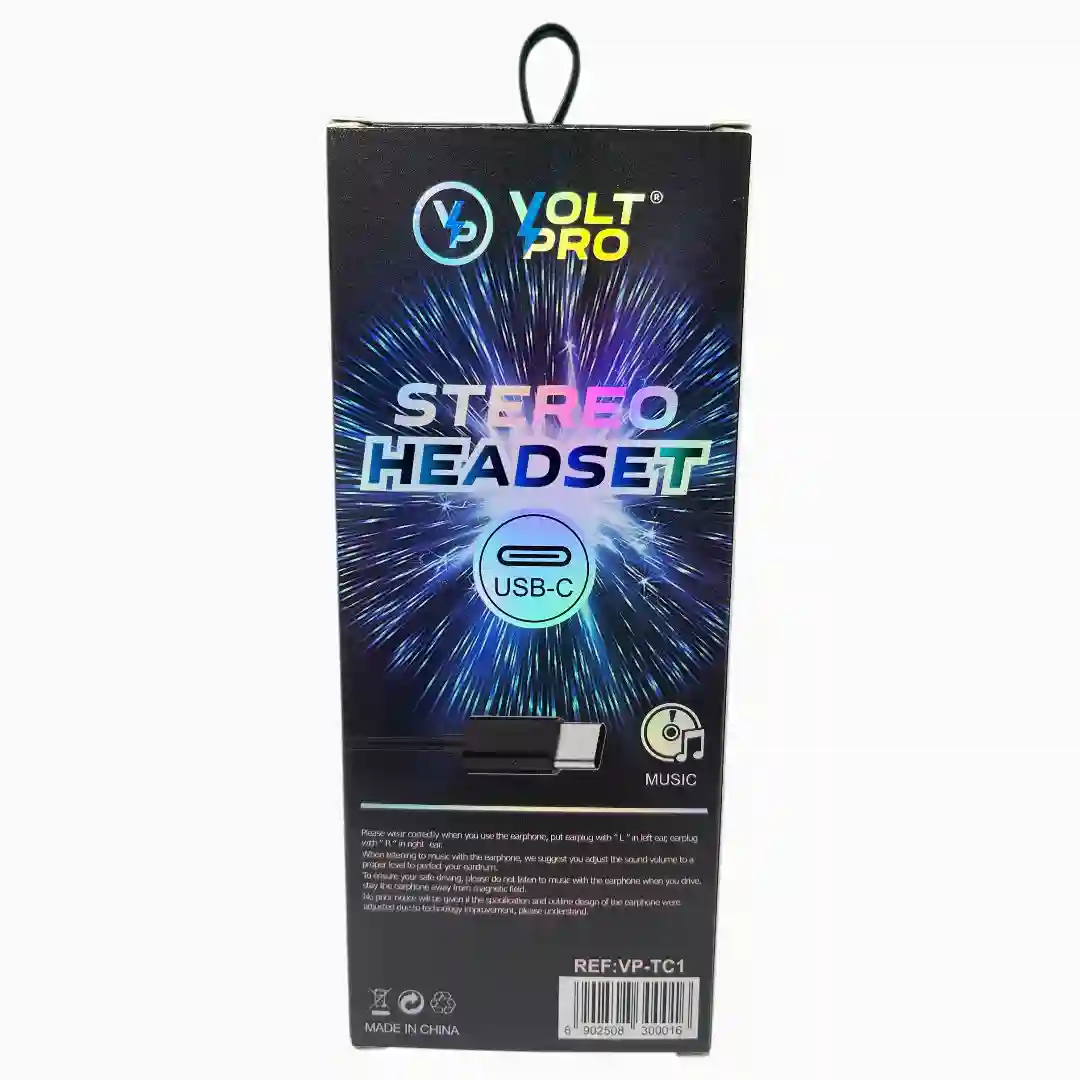 Marca: Voltpro Referencia: VP-TC1 Modelo: STEREO HEADSET Tipo de conector: USB-C Color: Negro Uso recomendado: Música y llamadas