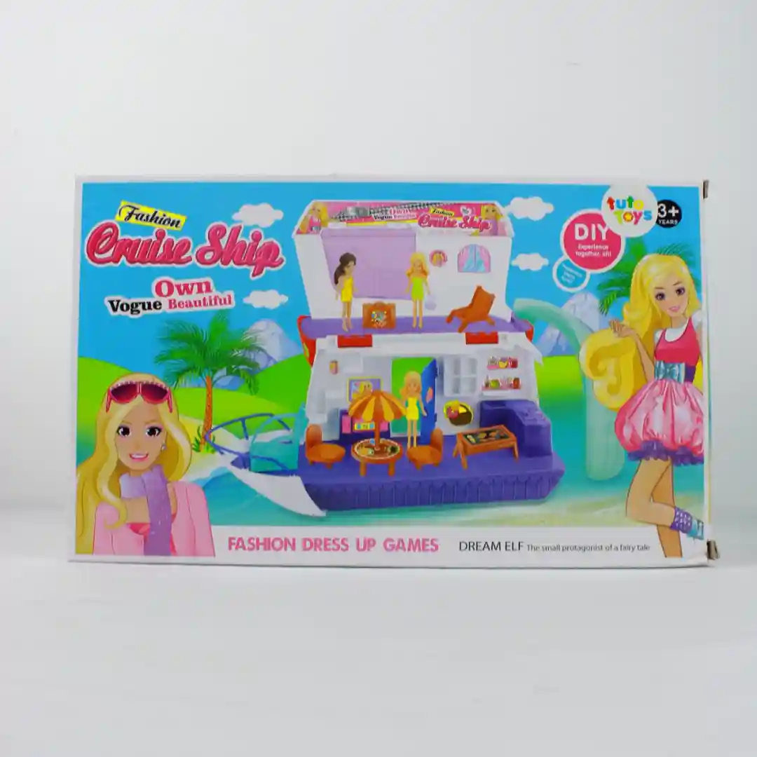 Muñecas y Accesorios Incluidos: Viene completo con varias muñecas de estilo «Fashion Doll» (similar a las Barbies, como se aprecia en la imagen y en la caja), listas para embarcarse en su viaje. Además, incluye una variedad de muebles y accesorios detallados para decorar el interior y exterior del barco, como: