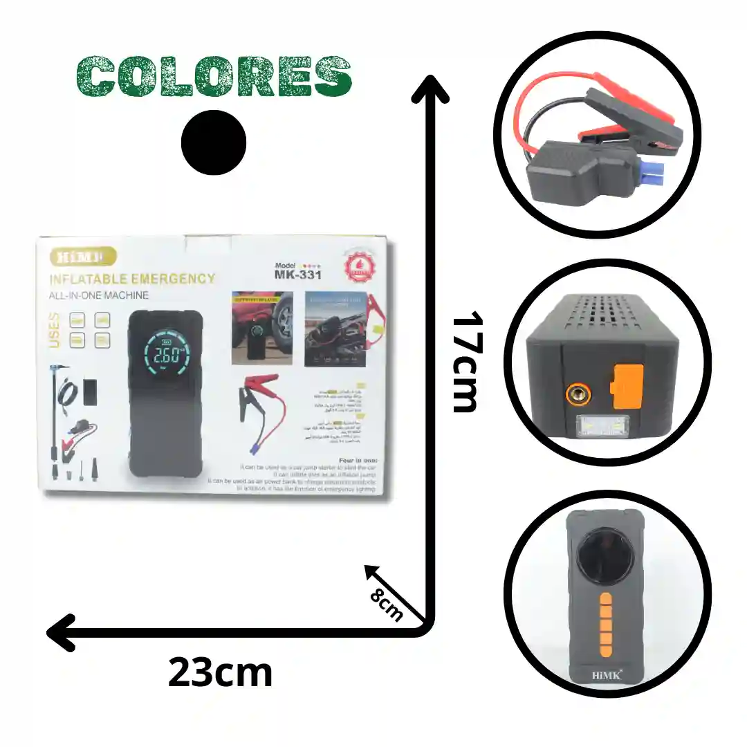 Máquina de emergencia todo en uno de diseño minimalista, diseñada para ofrecer soluciones integrales de energía y asistencia vehicular en un solo dispositivo portátil. Este equipo multifuncional actúa como arrancador de batería para vehículos, bomba de inflado para neumáticos, banco de energía para dispositivos electrónicos y sistema de iluminación de emergencia.