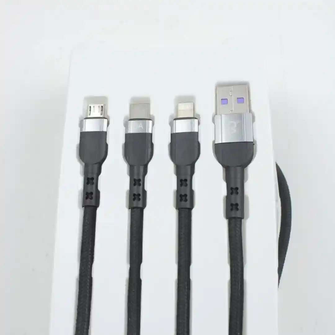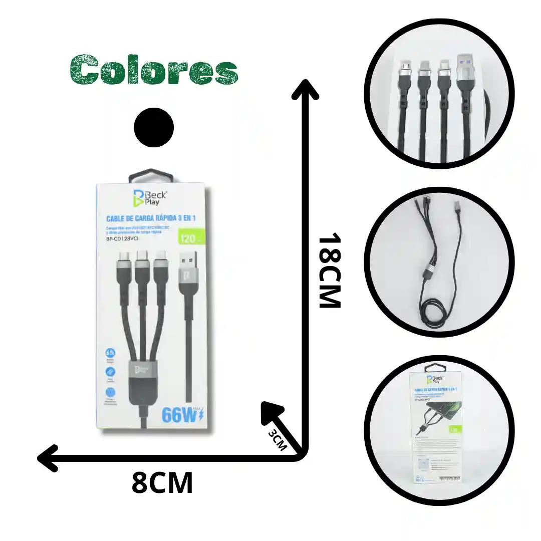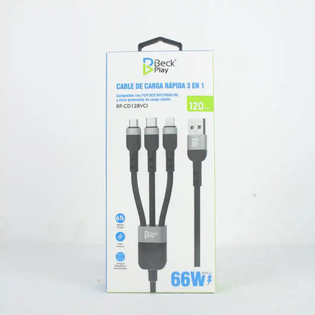 Presentamos el Cable de Carga Rápida Universal 3 en 1, referencia (Beck Play). Este cable de alta especificación resuelve la necesidad de compatibilidad total, combinando los tres conectores principales del mercado en un solo producto. Es un artículo de demanda masiva y alta rotación, ideal para minoristas de electrónica, tiendas de conveniencia y grandes almacenes.