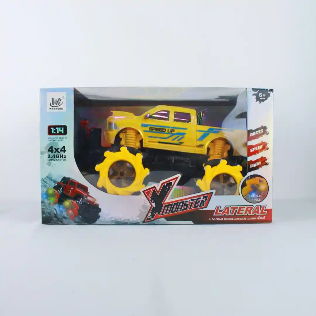 Este es un vehículo de juguete todoterreno diseñado para la acción, con un diseño de gran tamaño y un estilo agresivo que lo hace destacar. Su construcción robusta y su sistema de movimiento por fricción lo convierten en un juguete de alta durabilidad, sin necesidad de baterías. El diseño presenta una camioneta 4×4 con una combinación de colores vibrantes y pegatinas de estilo «off-road», que le confieren un atractivo visual fuerte para el público infantil.