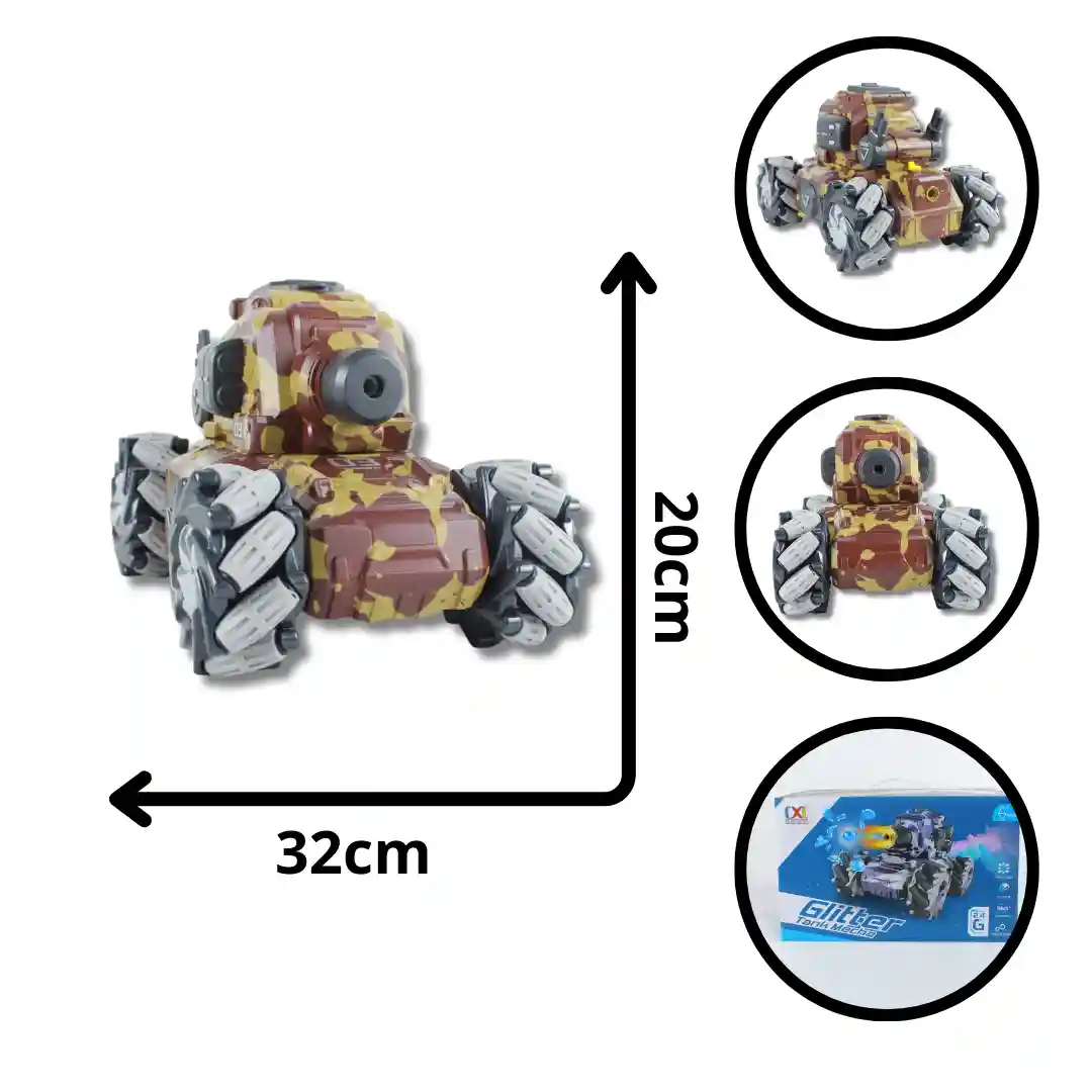El tanque de control remoto «Glitter Tank Mecha» (Referencia: CXL800-102D) es un juguete de acción que combina una estética de vehículo de combate con funciones interactivas de gran atractivo. Este modelo destaca por su capacidad de giro de 360°, las ruedas con tecnología omnidireccional y, de manera especial, por la función de lanzamiento de “balas” de hidrogel y vapor que simula un «lanzallamas», convirtiéndolo en un artículo de alta demanda para un mercado que valora la innovación en el juego.