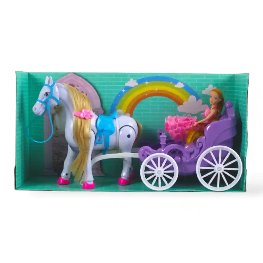 Carruaje Real: Un hermoso carruaje de color morado con detalles intrincados y ruedas funcionales. El diseño abierto permite que la princesa disfrute de un paseo real bajo un arcoíris imaginario, mientras sus pequeñas manos lo empujan o tiran.