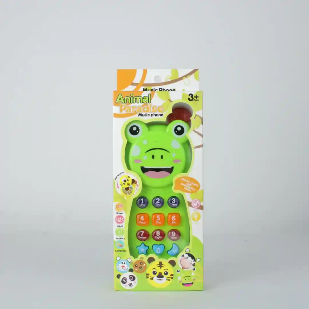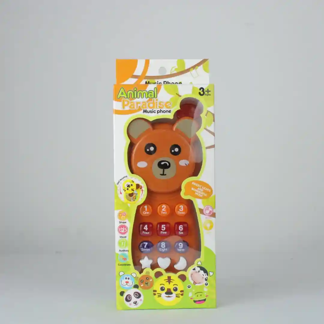 Juguete educativo e interactivo con forma de teléfono móvil, diseñado para el desarrollo temprano de habilidades en niños mayores de 3 años. Presenta un diseño amigable con temática de animales e incorpora luces y sonidos.