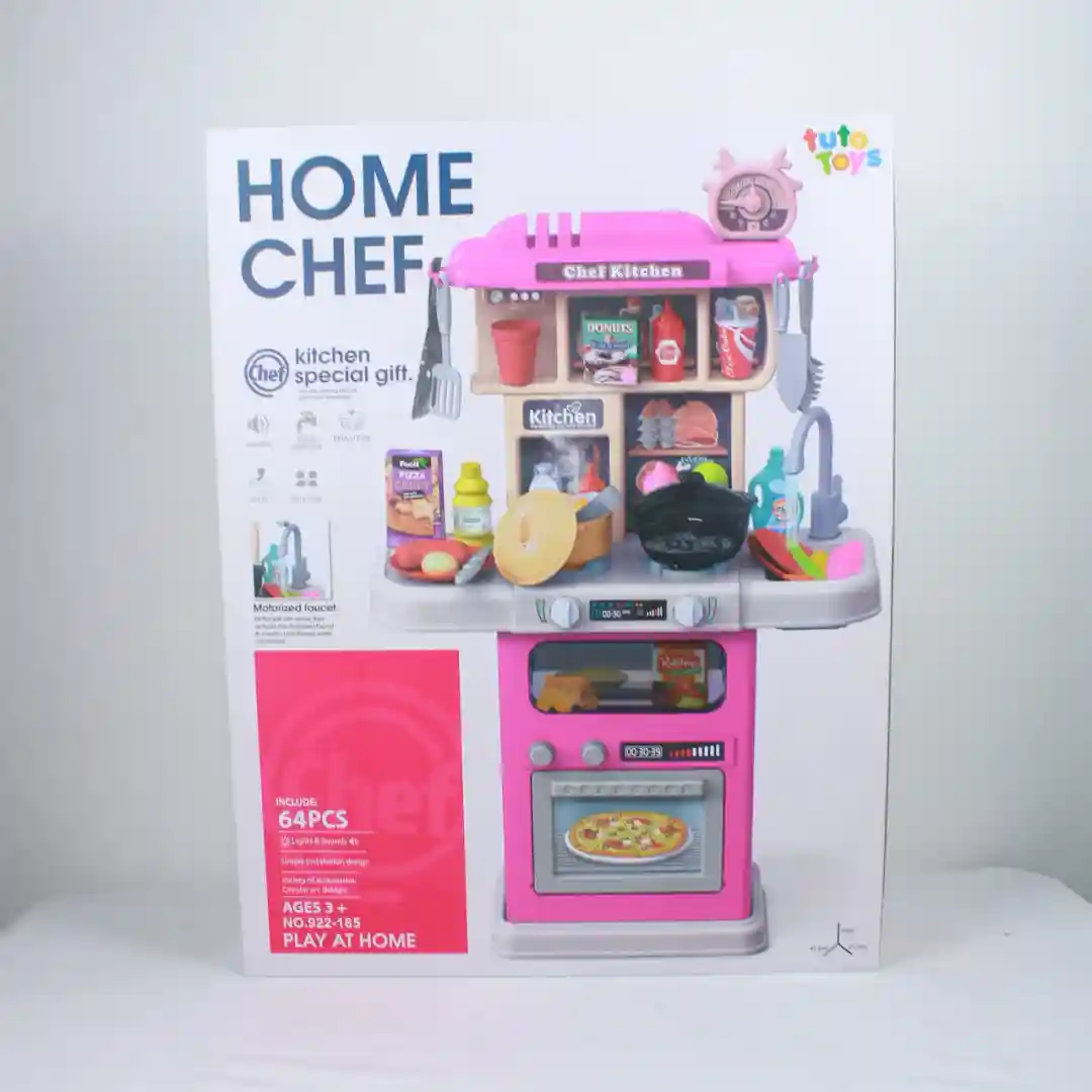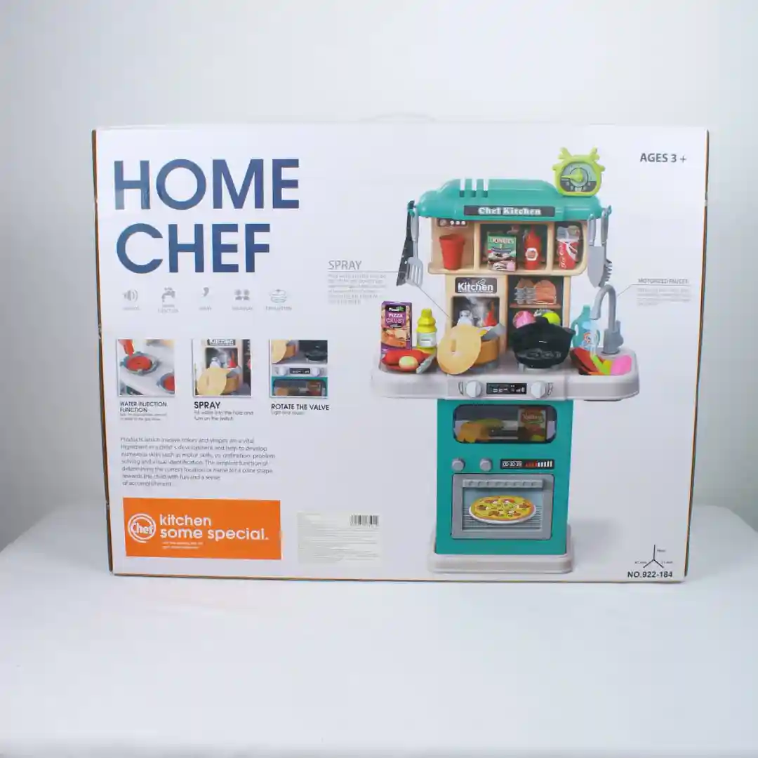 La cocina de juguete Home Chef (Referencia: 922-184) es un producto didáctico y divertido diseñado para niños mayores de 3 años. Este set de simulación de cocina destaca por sus características interactivas realistas como la función de vapor y burbujas, que lo convierten en una opción atractiva y de gran demanda en el mercado de juguetes.