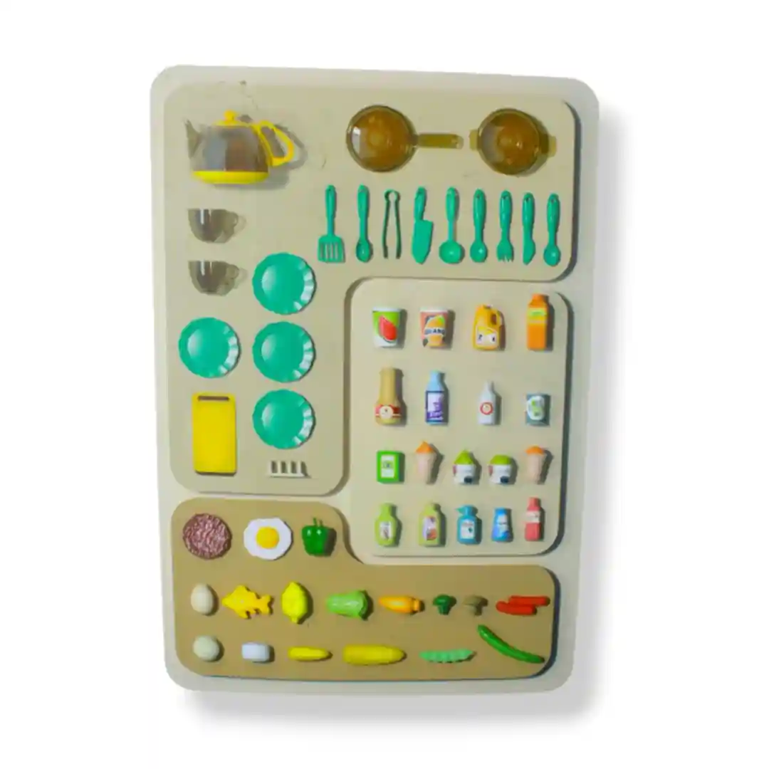 El set incluye una variedad de accesorios realistas que enriquecen la experiencia de juego. Encontrarás utensilios de cocina como sartenes y herramientas, así como una selección de alimentos de juguete que van desde vegetales y carnes hasta bebidas y postres. Además, cuenta con detalles como un horno, un fregadero con la capacidad de simular agua, y un refrigerador, que añaden realismo y posibilidades de juego.