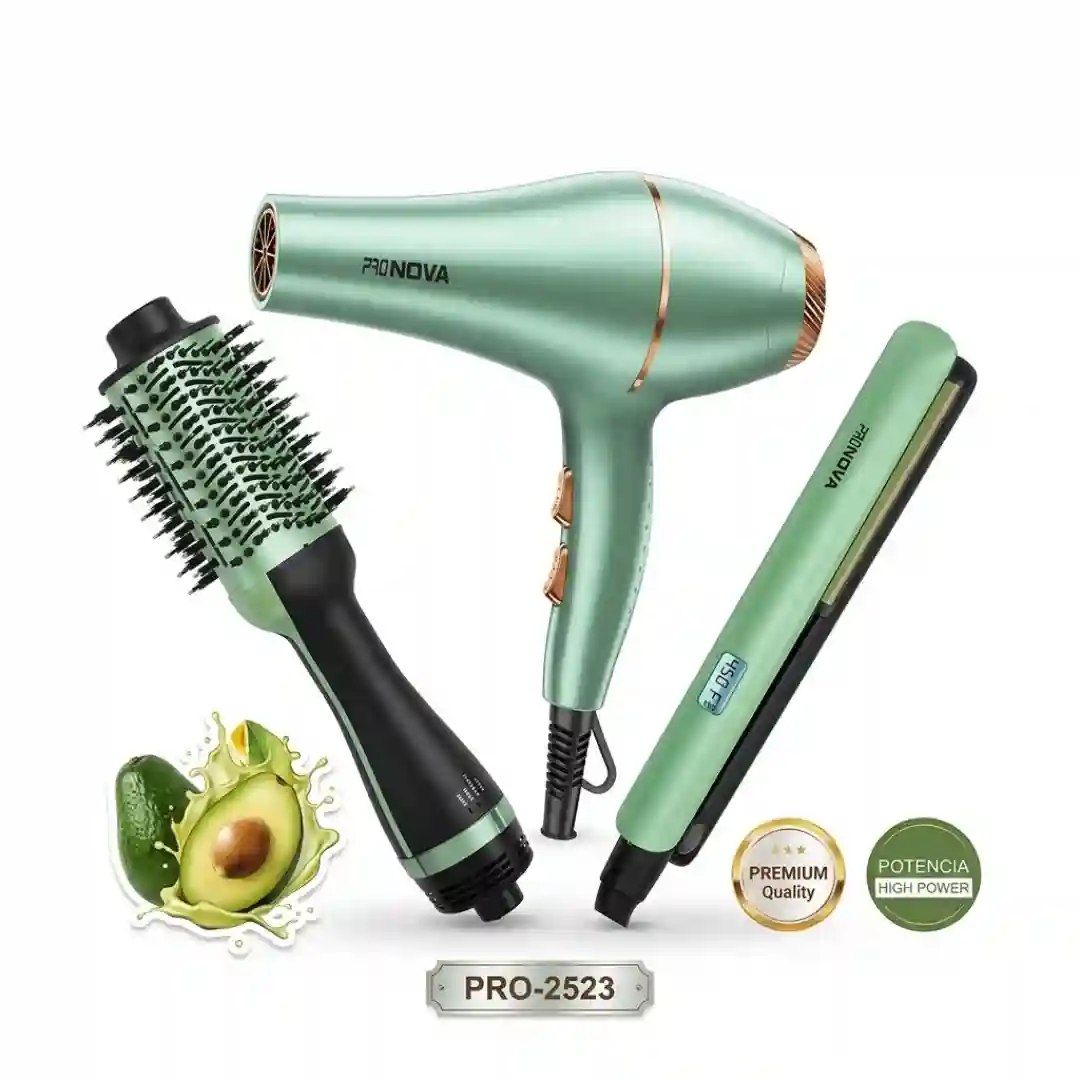 Kit profesional 3 en 1 de la línea Pro Nova que incluye secador de cabello, plancha alisadora y cepillo alisador. Este conjunto está diseñado con tecnología de terapia de aguacate 3D para proporcionar brillo y potencia al cabello. Los dispositivos presentan un acabado elegante en color verde con detalles en tonos dorados.