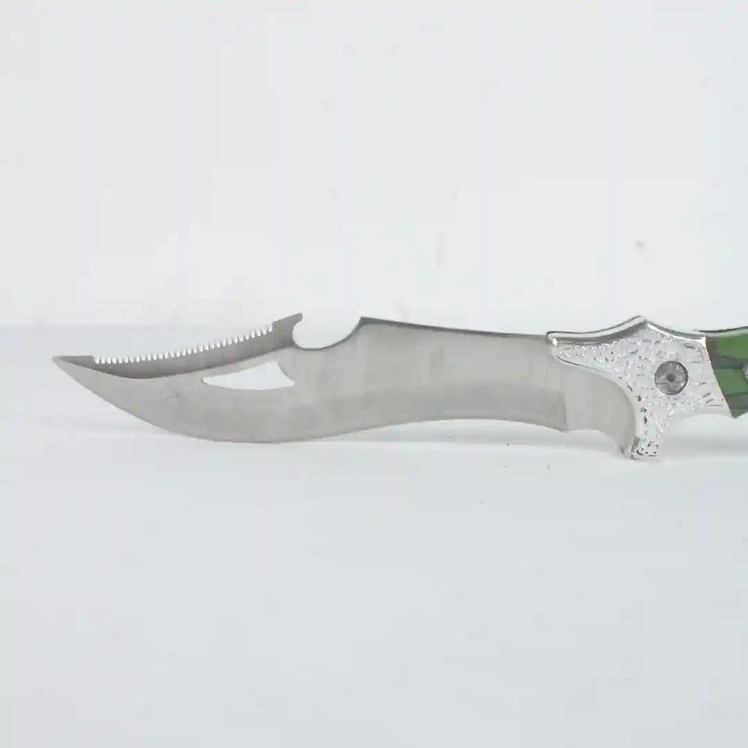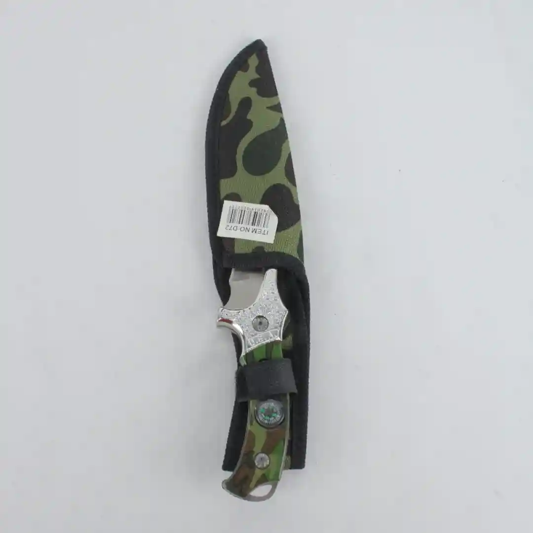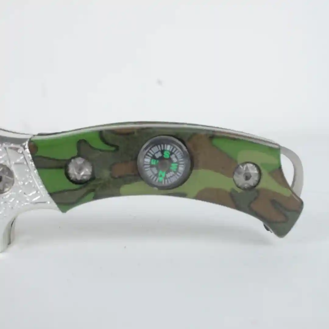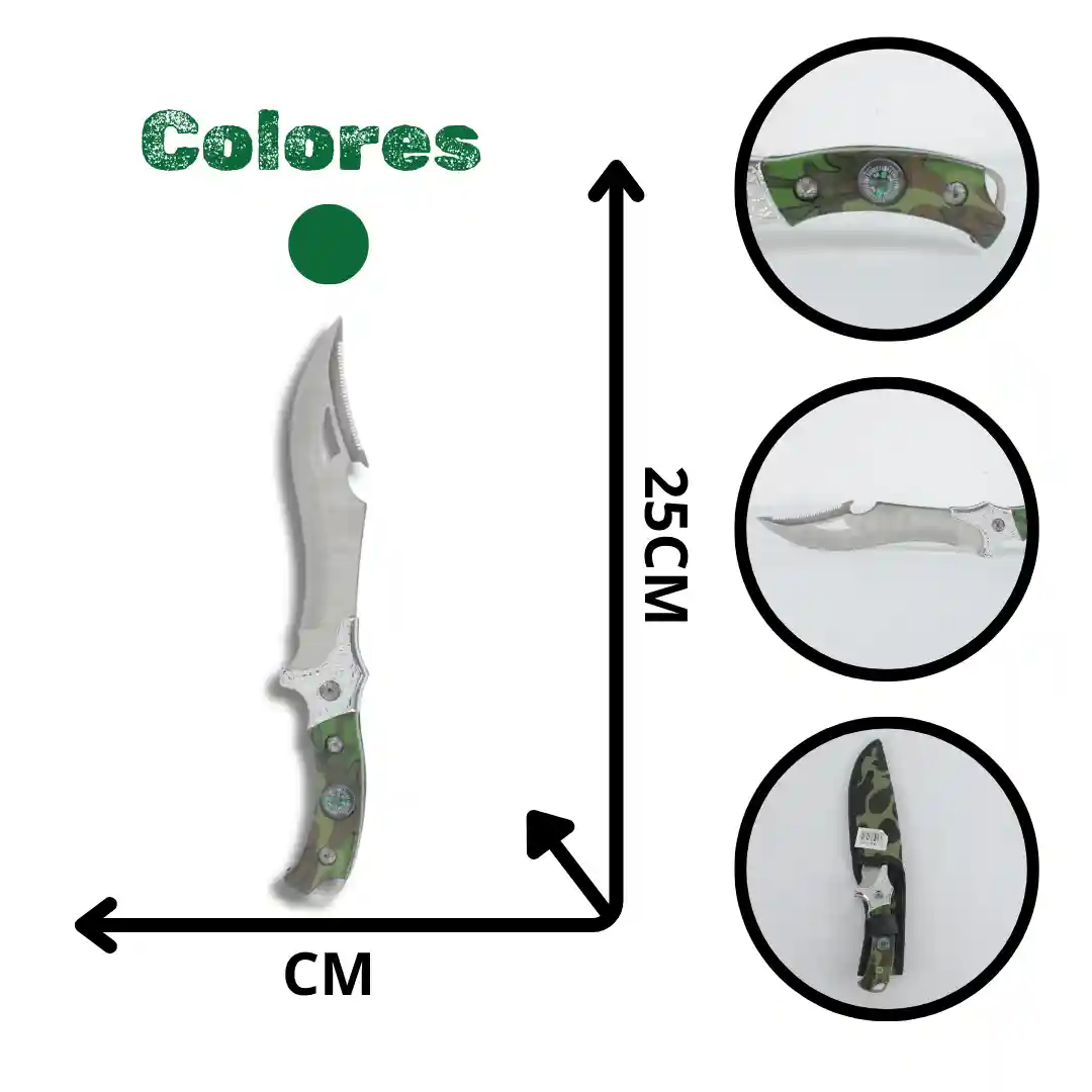 Material: Hoja de Acero Inoxidable de alta calidad; empuñadura con revestimiento en patrón de camuflaje militar (color verde).