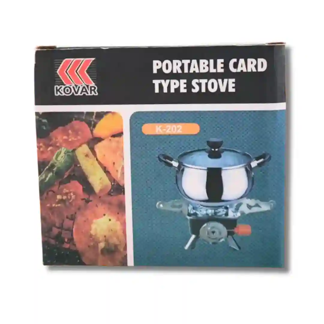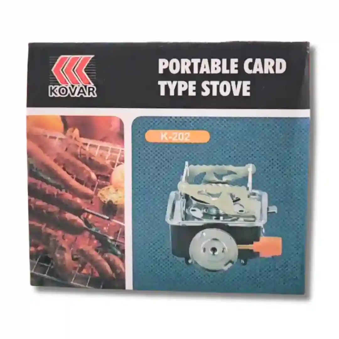 Estufa portátil tipo tarjeta diseñada para actividades al aire libre y campismo. Este modelo compacto destaca por su estructura metálica robusta en color rojo y cromo, optimizada para ofrecer eficiencia y estabilidad en cualquier entorno. Su diseño plegable permite un almacenamiento práctico y seguro, facilitando su transporte en cualquier mochila o equipo de viaje.