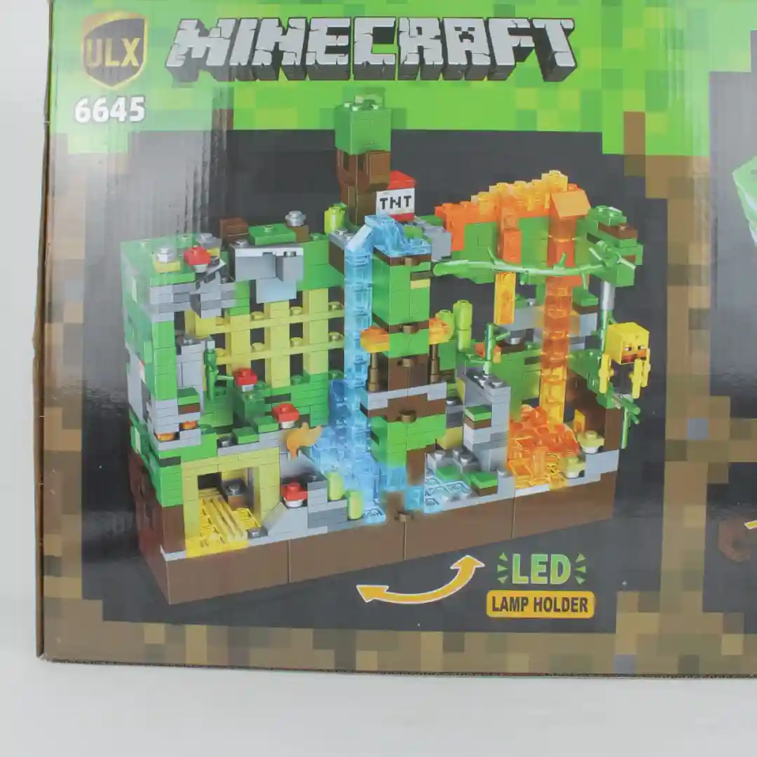 Componentes Clave: Incluye elementos icónicos como TNT, cascadas, vegetación, y figuras de personajes y criaturas del juego.
