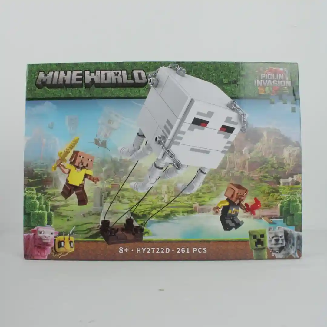 Piglin Invasion: Con 261 piezas, esta caja es pura adrenalina. Un par de minifiguras de Piglin (uno con espada dorada) se enfrentan a un enorme y aterrador Ghast (fantasma) flotando con cadenas. ¡La aventura aérea y el Nether se unen!