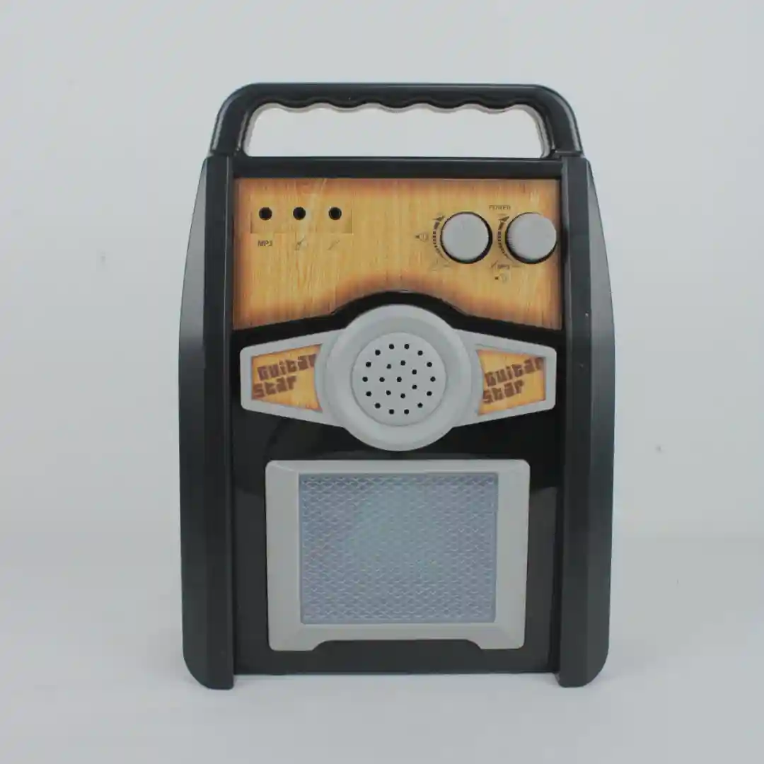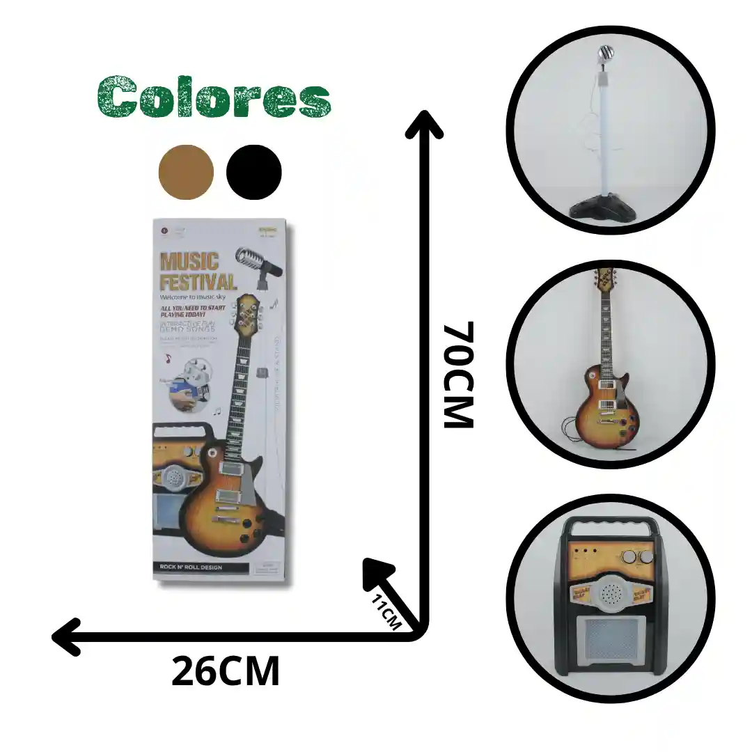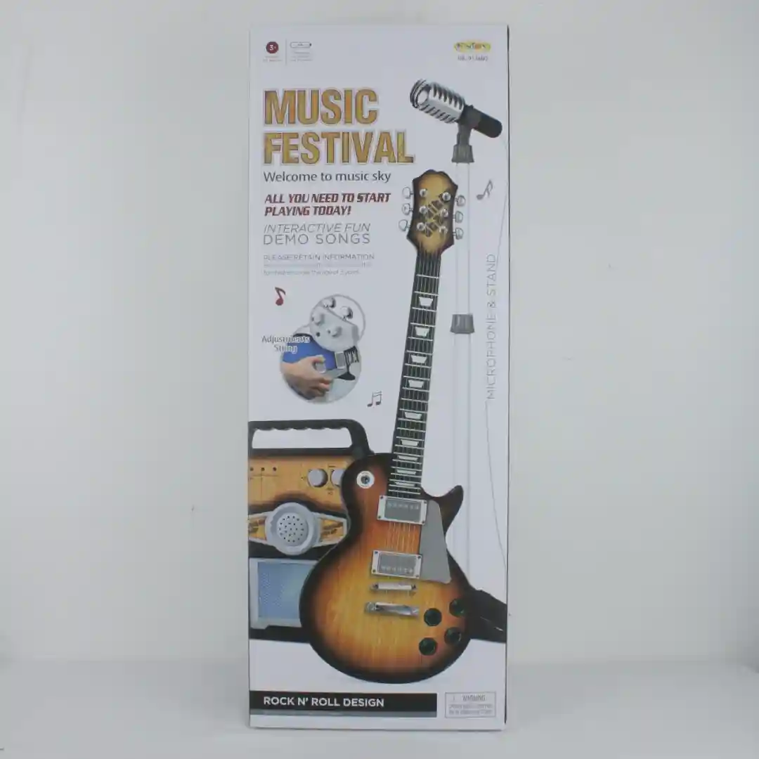 Presentación: Caja de cartón alargada a todo color, que exhibe claramente la guitarra, el micrófono y el amplificador, destacando su diseño Rock N’ Roll.