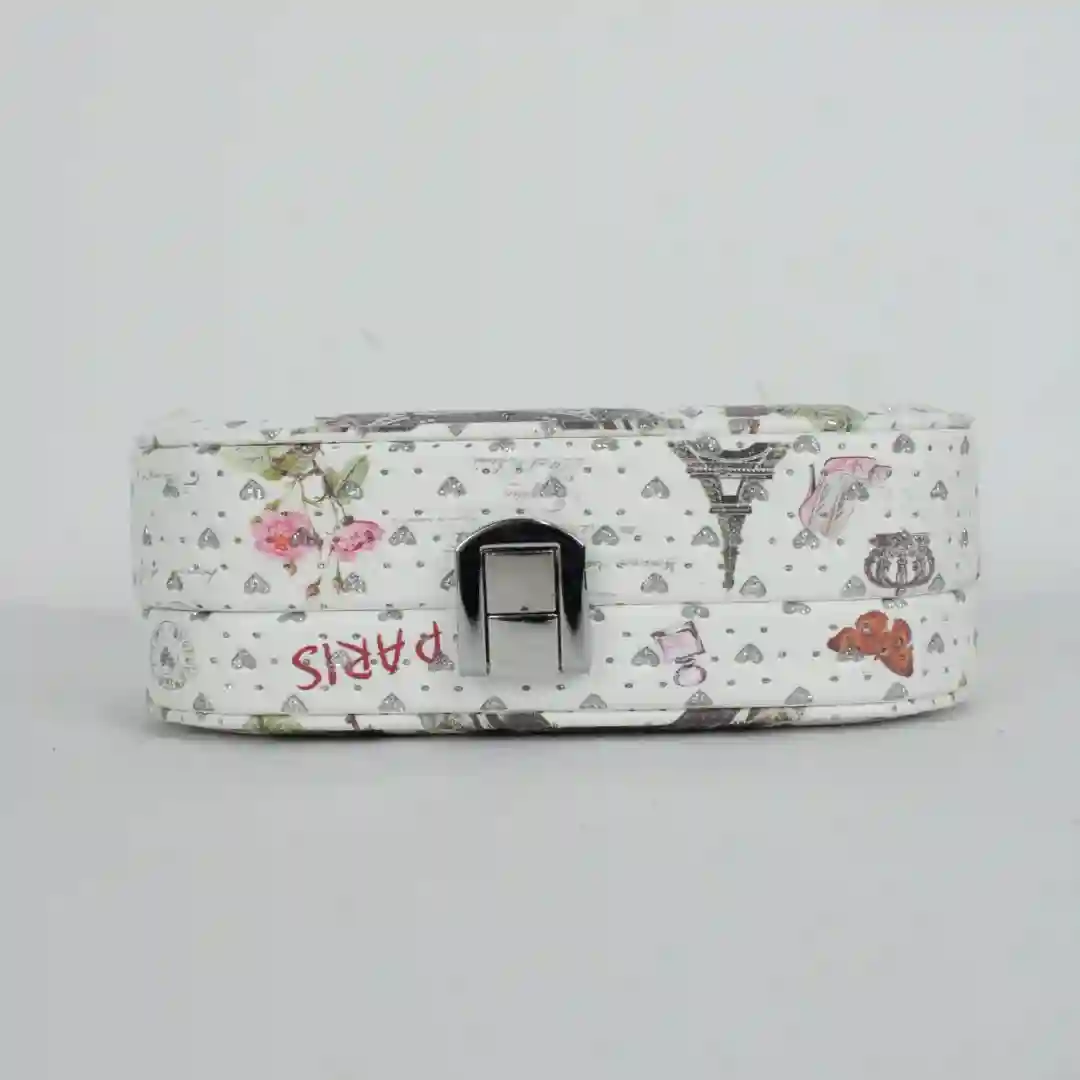 Estuche organizador de joyas con diseño compacto y funcional, ideal para el resguardo y transporte seguro de accesorios personales. Este joyero presenta un acabado exterior con estampados decorativos elegantes y una estructura rígida que protege el contenido contra impactos. Su interior está revestido con un material suave al tacto para evitar rayaduras, incluyendo compartimentos especializados para anillos, aretes y cadenas, optimizando el espacio de manera organizada.