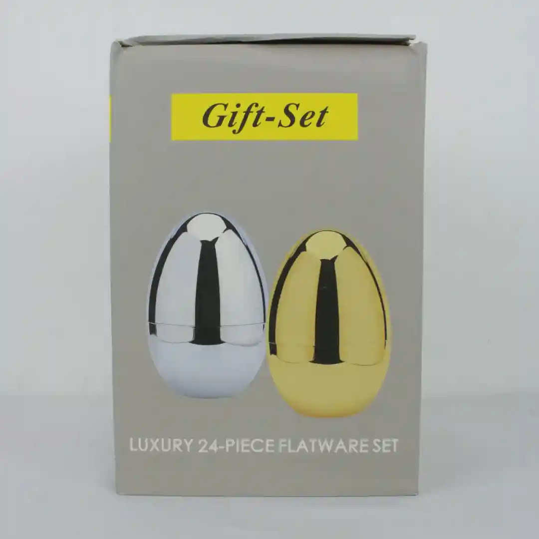 Exclusivo y sofisticado Set de Cubiertos de Lujo de 24 Piezas con un diseño de almacenamiento premium en forma de huevo. Esta variante presenta un acabado tipo mármol blanco con elegantes vetas doradas, creando un impacto visual de alto nivel. Clasificado como un set de regalo, es un producto de alta gama ideal para la reventa en tiendas de regalos de lujo, boutiques de decoración y establecimientos enfocados en el segmento premium.