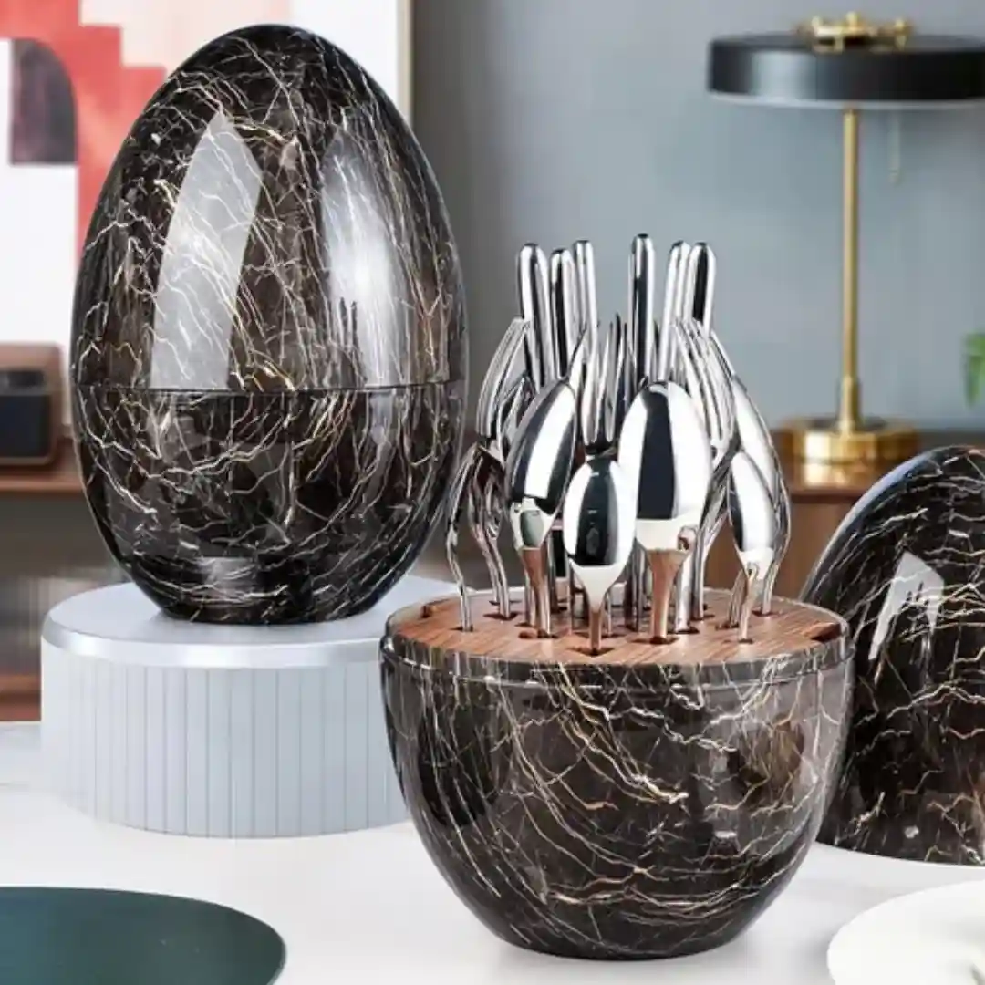 Elegante y moderno Juego de Cubiertos de Acero Inoxidable de 24 Piezas con un diseño de almacenamiento único en forma de huevo con acabado tipo mármol negro y vetas doradas/blancas. Este set combina alta calidad, estilo nórdico y una presentación inigualable, siendo un producto de alto valor percibido ideal para la reventa en tiendas de artículos para el hogar, regalos premium y decoración.
