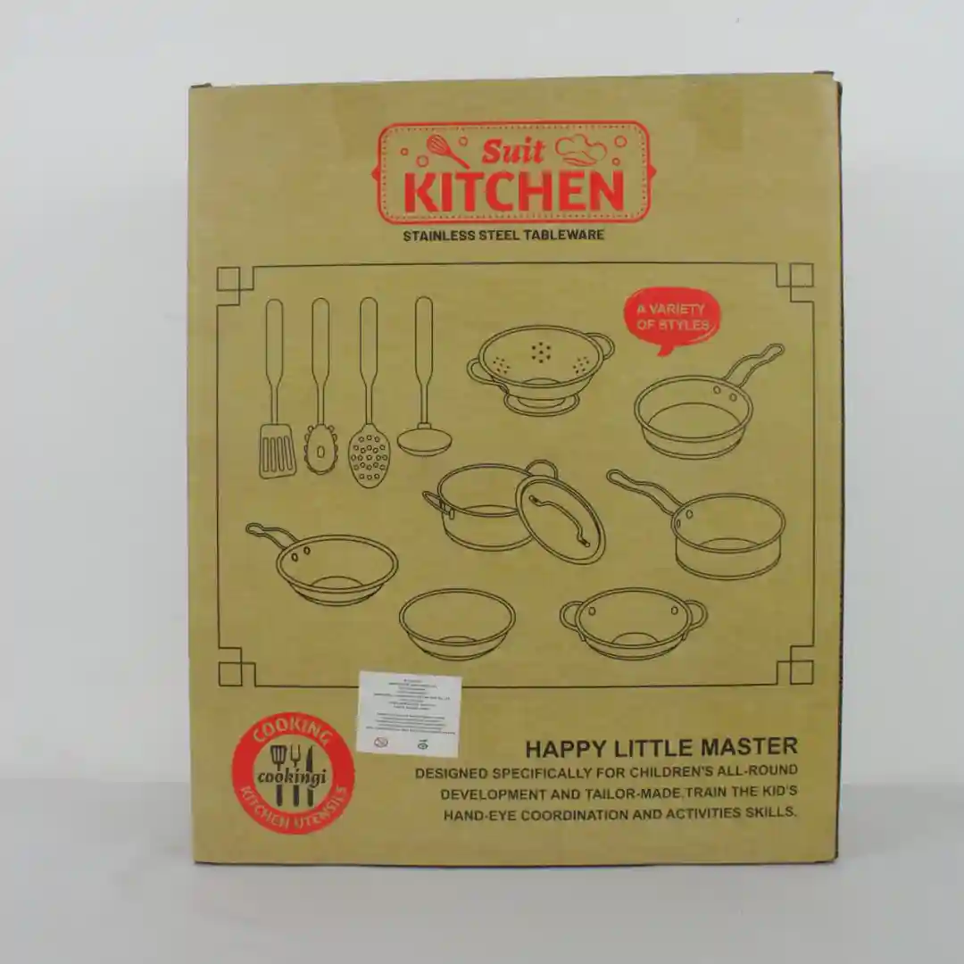 Completo set de utensilios de cocina a escala infantil, fabricado con materiales de alta calidad, diseñado para el juego de roles y la estimulación creativa en niños.