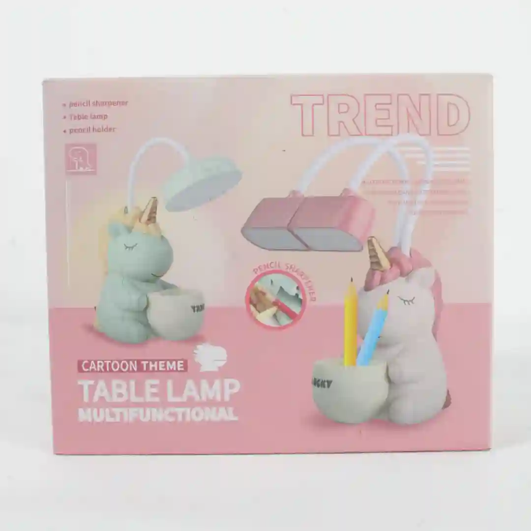 Lámpara de escritorio multifuncional con diseño temático de dibujos animados, ideal para el aprendizaje y la organización en espacios infantiles. Este dispositivo integra una fuente de iluminación ajustable, un sacapuntas integrado y un portalápices, combinando utilidad y estilo en un solo producto. Su estructura flexible permite orientar la luz de manera precisa, mientras que su diseño de personaje de dinosaurio o unicornio añade un toque decorativo y divertido al escritorio.