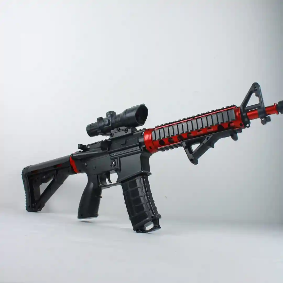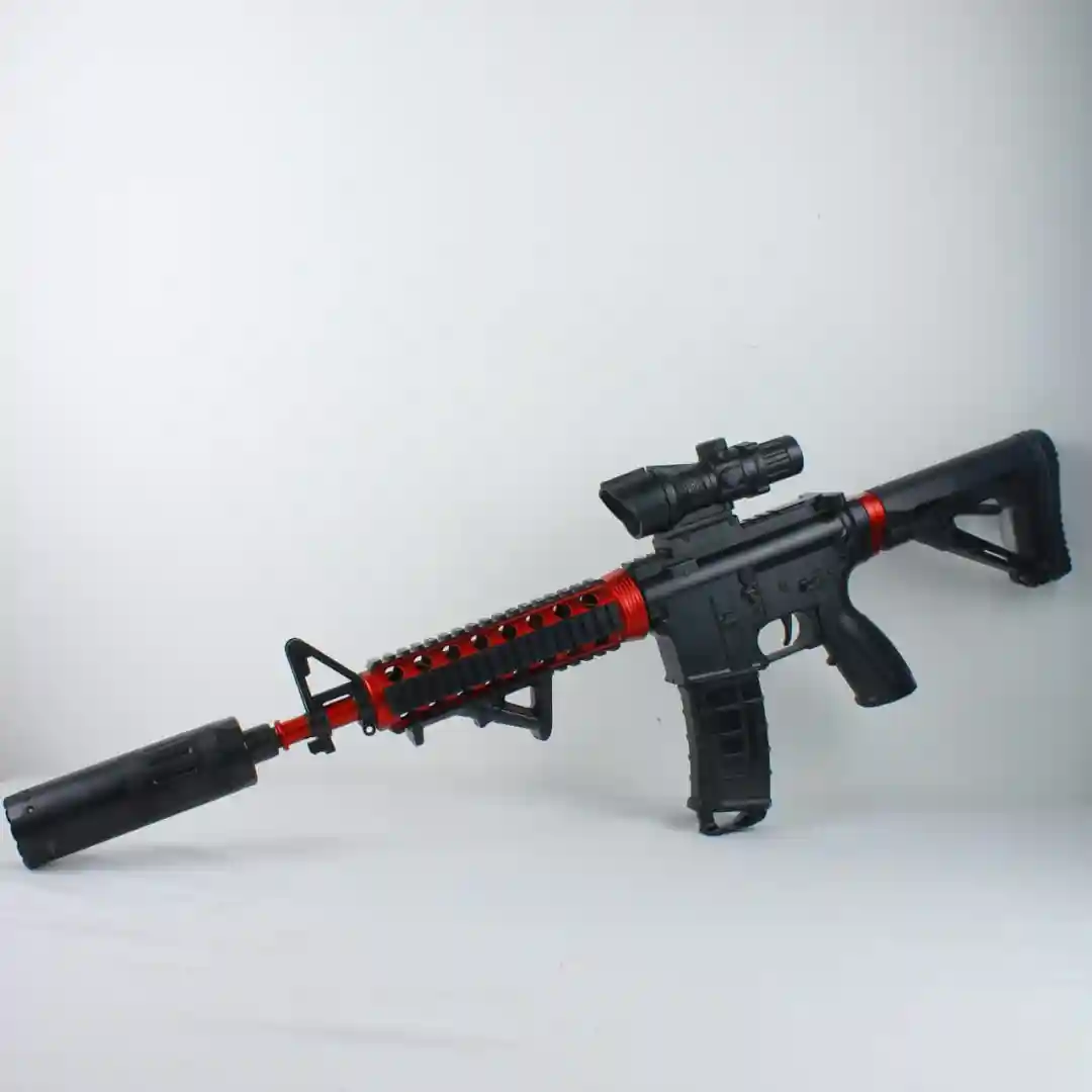 Contenido del Paquete: 1 Lanzador de hidrogel, 1 Silenciador, 1 Mira de punto rojo, 1 Batería, 1 Cable de carga y 1 Sachet de bolas de hidrogel.