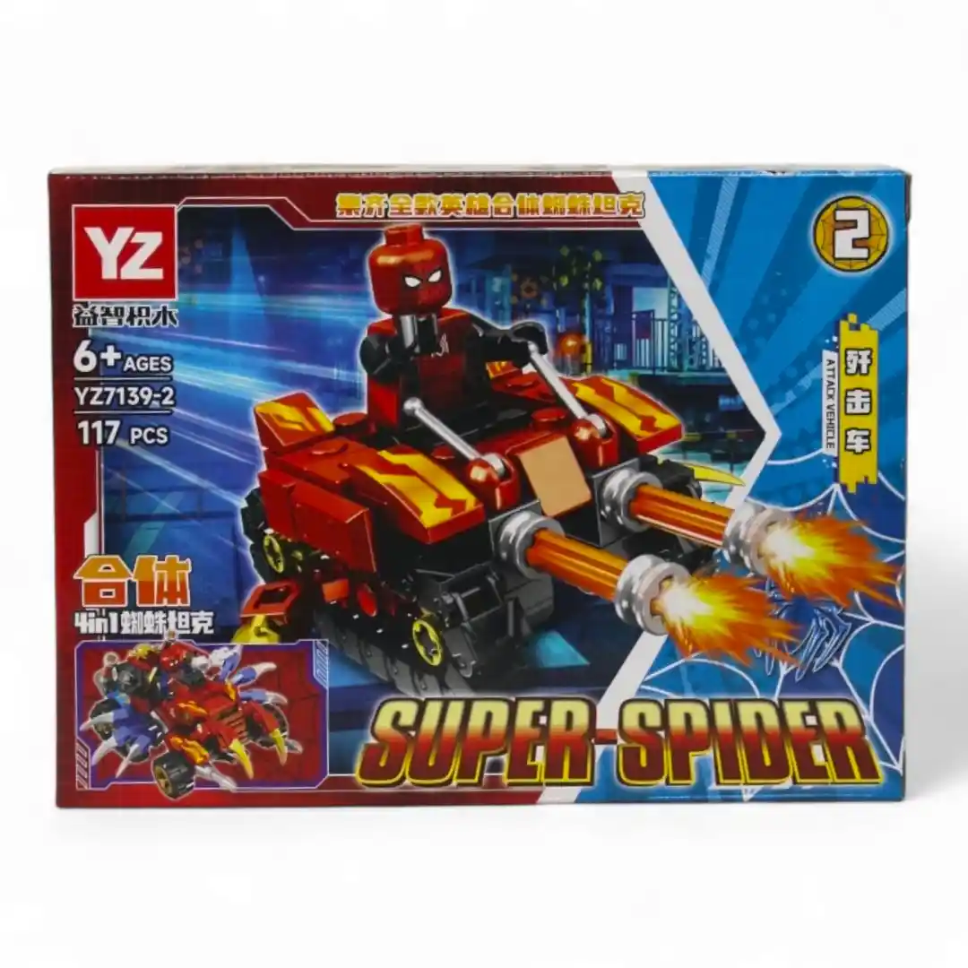 Este set, identificado como Attack Vehicle y parte de la colección Super-Spider, es perfecto para jóvenes constructores y fans de Spider-Man a partir de los 6 años. La imagen de la caja muestra una impresionante máquina de combate en tonos rojo y dorado, con potentes cañones frontales que disparan energía, ideal para enfrentar a cualquier villano. La minifigura incluida es una versión de Spider-Man con un traje mejorado, lo que sugiere una variante más tecnológica del héroe arácnido.