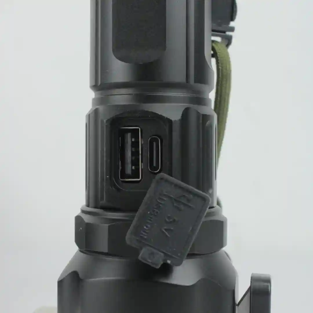 Puerto de carga USB integrado en el cuerpo de la linterna, protegido por un sello hermético.