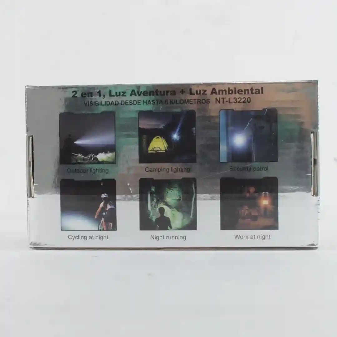 Presentación del Empaque Individual: Caja de cartón con acabado brillante (metálico) que ilustra las funciones de iluminación y los usos profesionales.