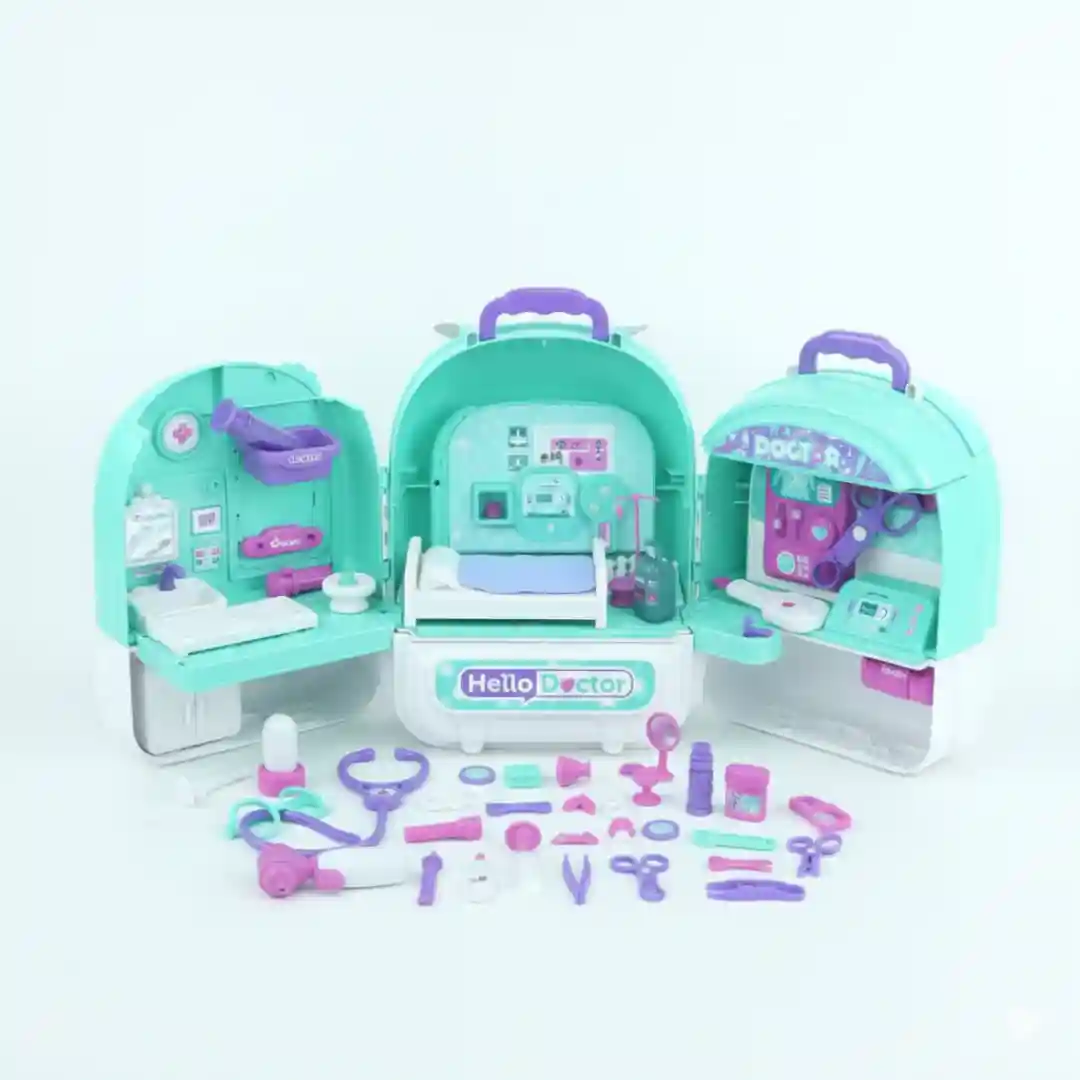 En el interior, podrás ver una estructura organizada con compartimentos para cada herramienta. Esta característica fomenta la responsabilidad y el orden en los niños, ya que aprenden a identificar dónde va cada instrumento después de usarlo, simulando la seriedad de un profesional. Además, cuenta con una práctica asa de transporte en la parte superior, que permite que el pequeño doctor pueda llevar su clínica a todas partes: a la cama de un paciente (un osito de peluche), al salón de casa o de visita a un amigo.