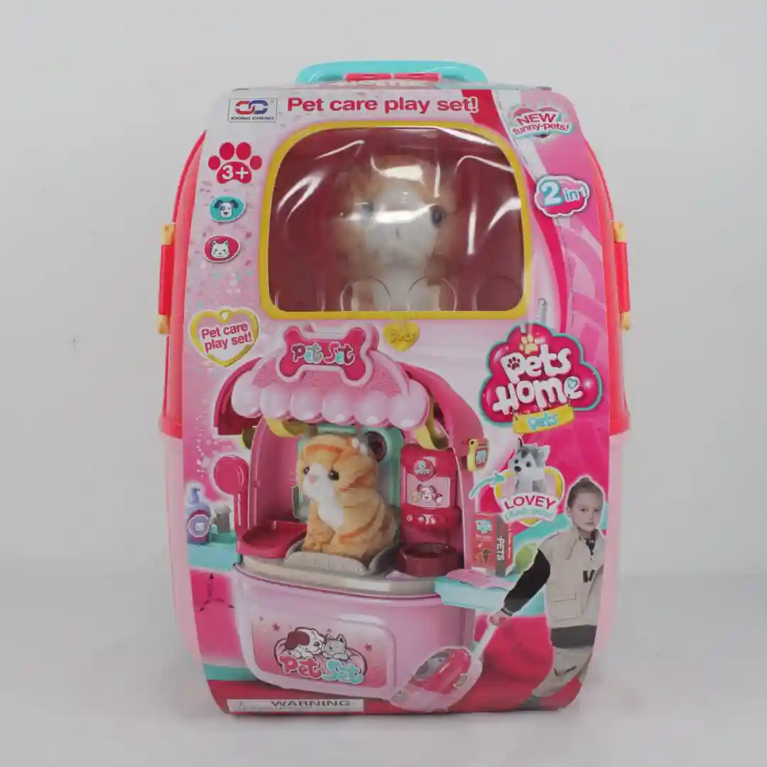 Presentamos el Set de Cuidado de Mascotas Portátil con Gato de Peluche (Pet Care Play Set). Este es un artículo de juego de rol convertible 2 en 1 que se transforma de una práctica maleta trolley a una completa estación de peluquería/veterinaria para mascotas. Es un producto de alto atractivo y excelente rendimiento para tiendas de juguetes y minoristas de regalos.