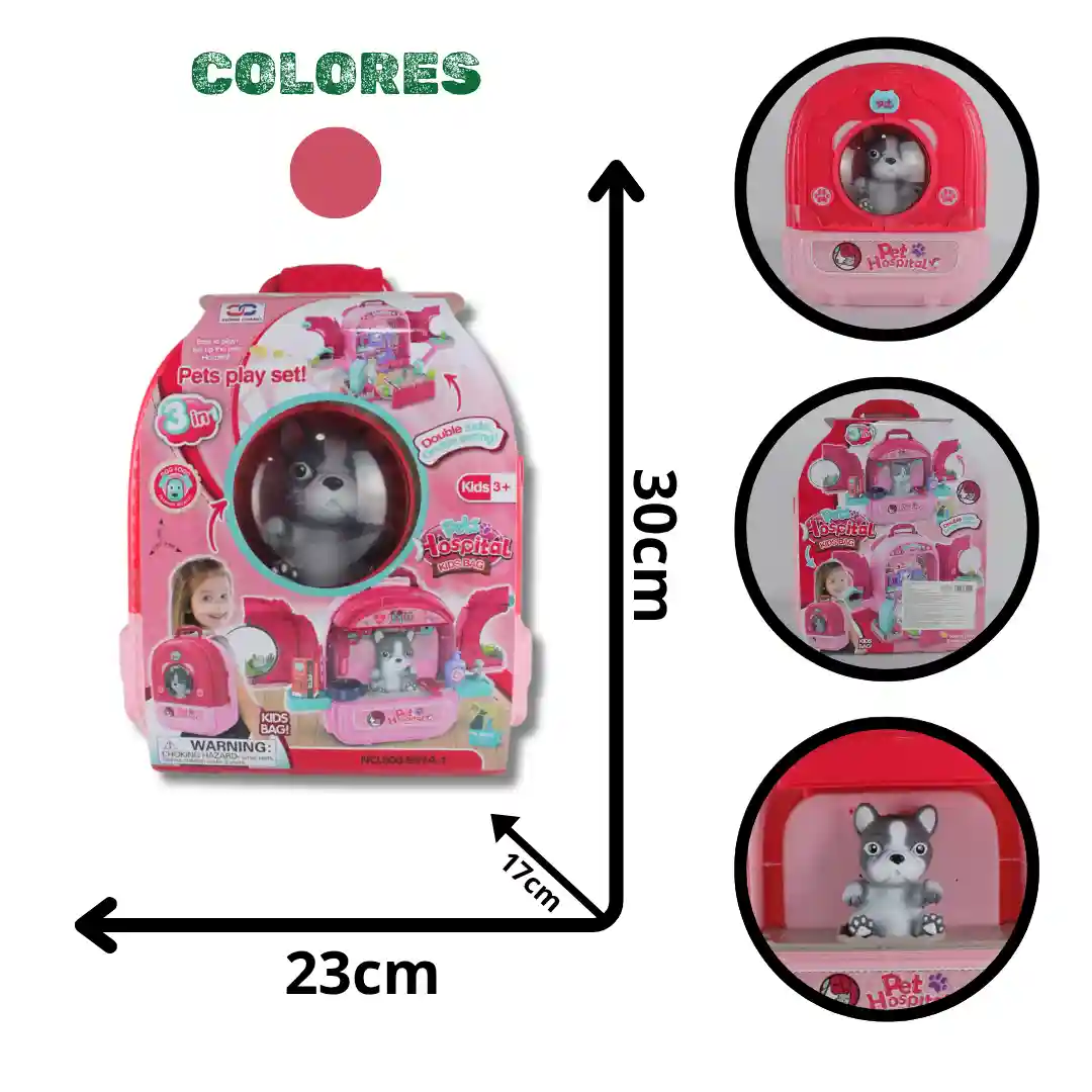 Este set de juego modular y portátil ofrece una experiencia completa de «Hospital Veterinario» en un formato de maleta 3 en 1. El diseño innovador permite que el niño lleve el juguete como mochila (Kids Bag), lo despliegue en un puesto de veterinario de doble cara (Double Side, Double Setting), y juegue con la figura de la mascota y los accesorios. Es un artículo de alta comercialización en el segmento de juguetes de rol.