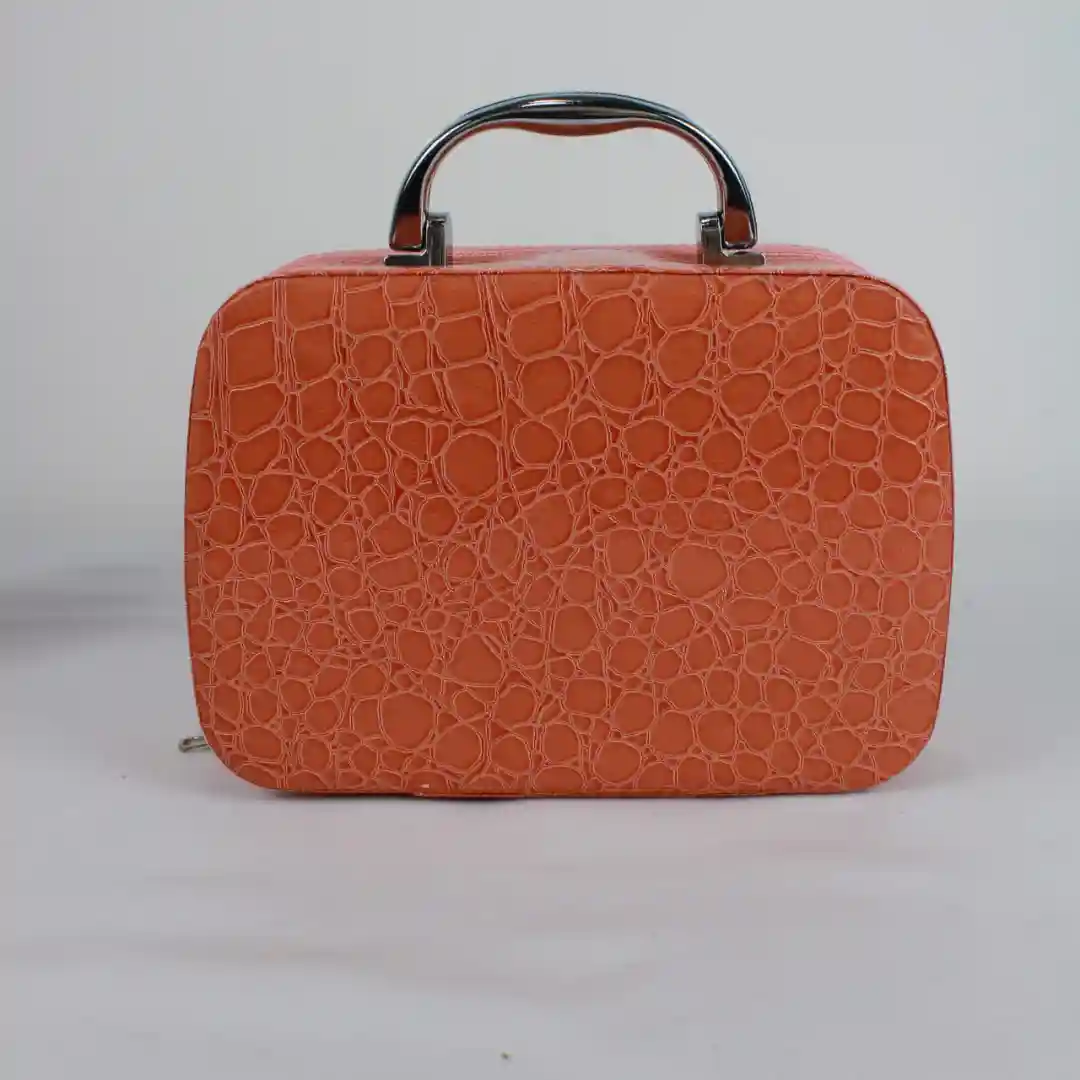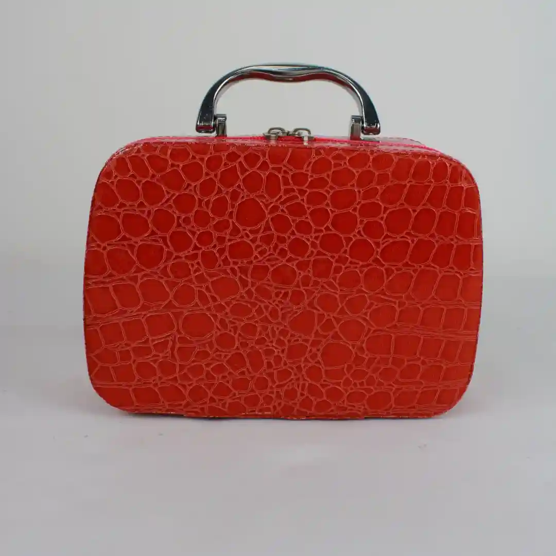 Material: Exterior con acabado de imitación de piel de cocodrilo, disponible en múltiples colores (Rojo, Naranja y Verde Menta). Asa metálica para un transporte cómodo y seguro.