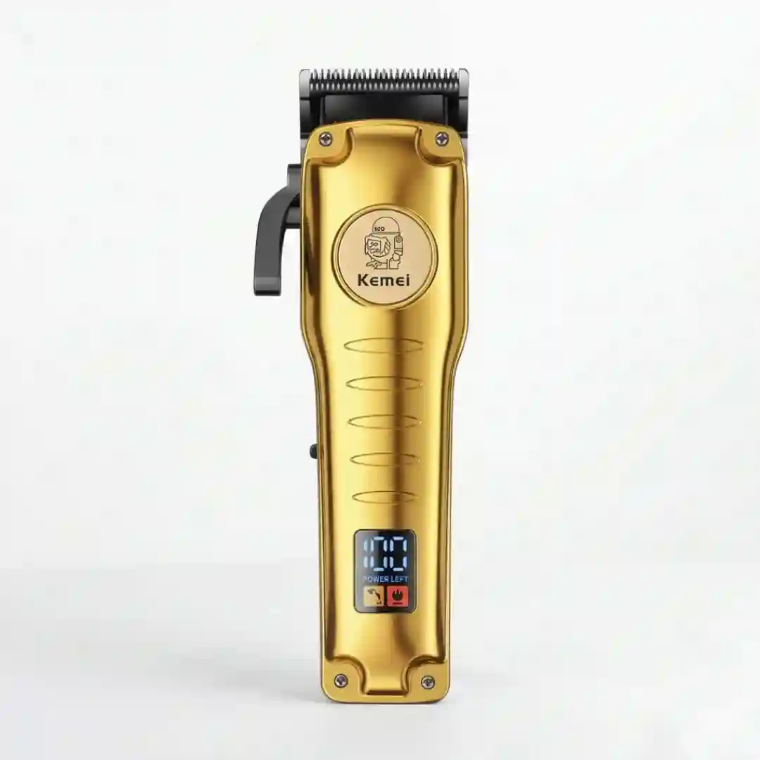 Cortadora de cabello recargable con diseño moderno y elegante, fabricada con un acabado en color deslumbrante. Esta herramienta profesional combina alta potencia con una cuchilla de precisión diseñada para uso dual en corte de cabello y afeitado. Su estructura ergonómica cuenta con una pantalla digital inteligente que facilita el control del rendimiento durante su uso.