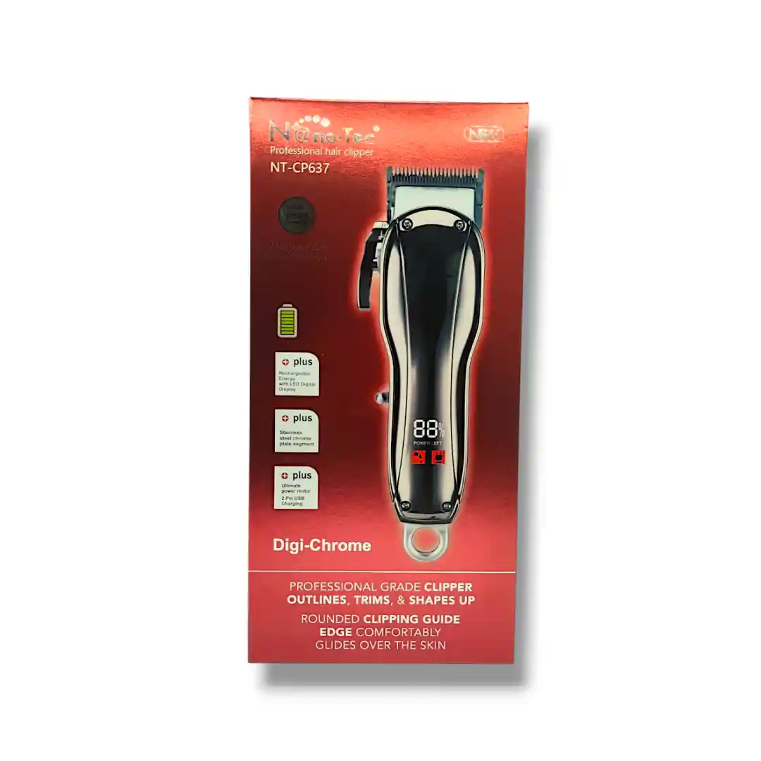 La MÁQUINA PELUQUERA NANOTEC NT-CP637 Digi-Chrome está diseñada para ofrecerte resultados de peluquería profesional. Perfecta para cortes de cabello, retoques, delineados y para mantener tu estilo siempre a punto, esta máquina se convertirá en tu herramienta esencial de cuidado personal.