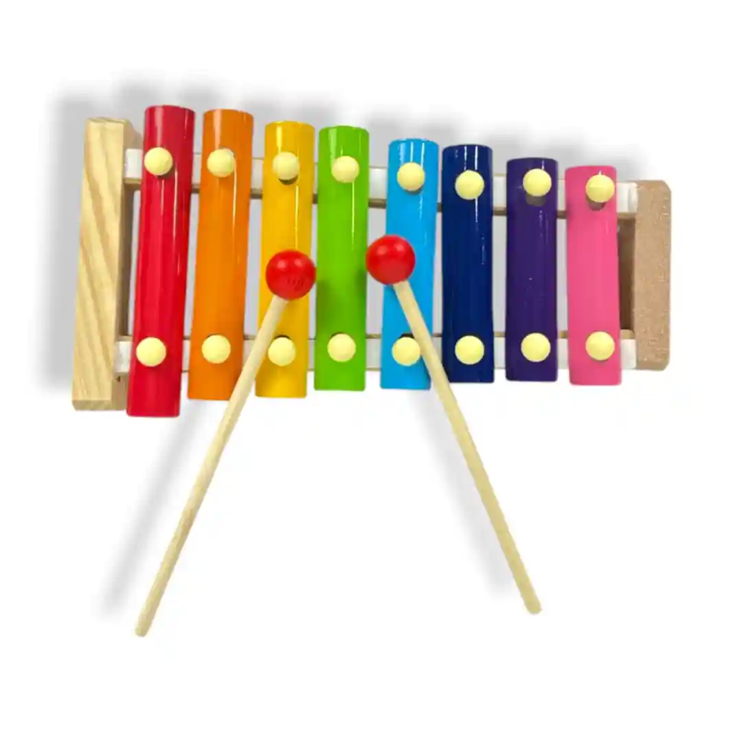 Instrumento Musical Educativo: Esta marimba cuenta con 8 barras metálicas de diferentes colores que corresponden a distintas notas musicales, permitiendo a los niños explorar sonidos y melodías de forma intuitiva.