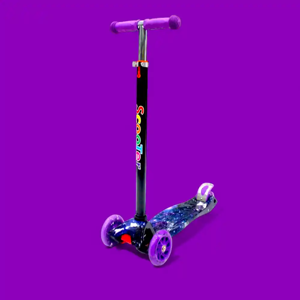 - Estampado Espacial Atractivo: La abse del scooter presenta un vibrante estampado con temática espacial, que captura la imaginación de los niños y les invita a soñar con galaxias y aventuras intergalácticas.
